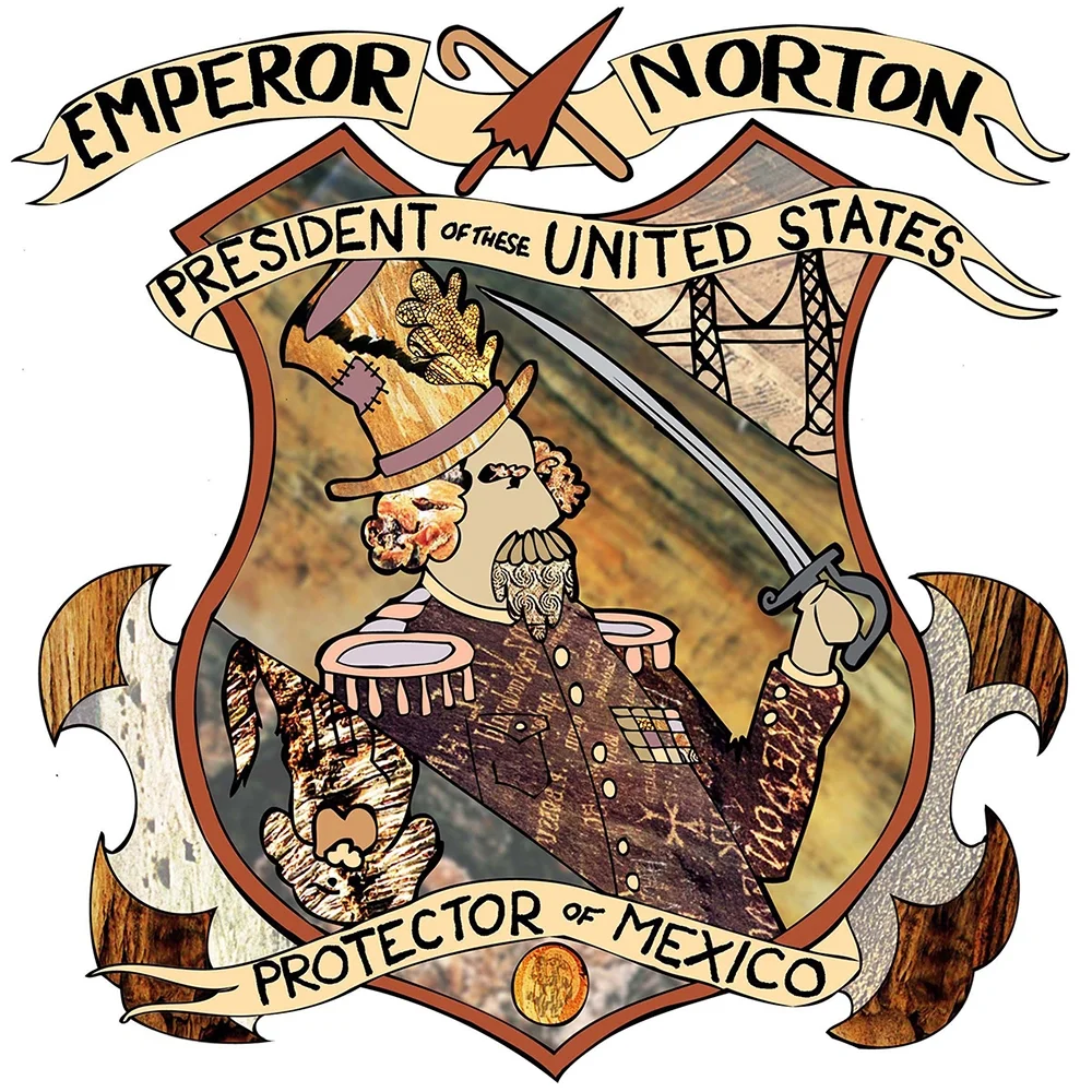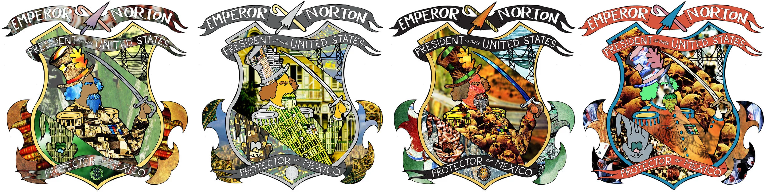 A series of mixed media crests commemorating one of history's most sovereign citizens, Emperor Joshua Abraham Norton. The collage texture elements were taken from National Geographic magazine photos.
